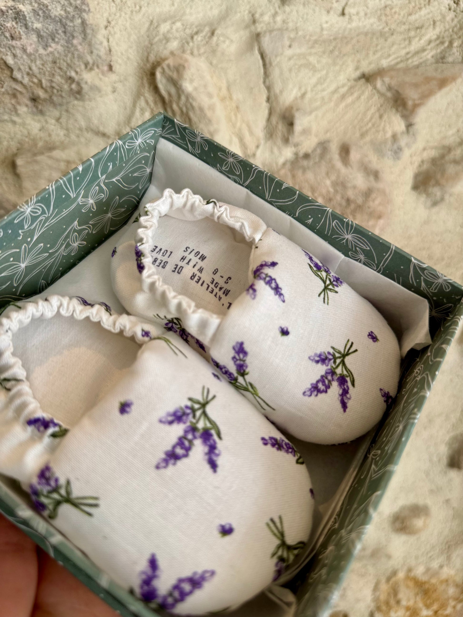 Leur tissu délicat protège les petits pieds tout en assurant une agréable sensation de douceur. Le motif imprimé de petites lavandes ajoute une touche charmante et élégante, faisant de ces chaussons un cadeau parfait qui séduira à coup sûr. Idéal pour garder les pieds de bébé au chaud avec style.