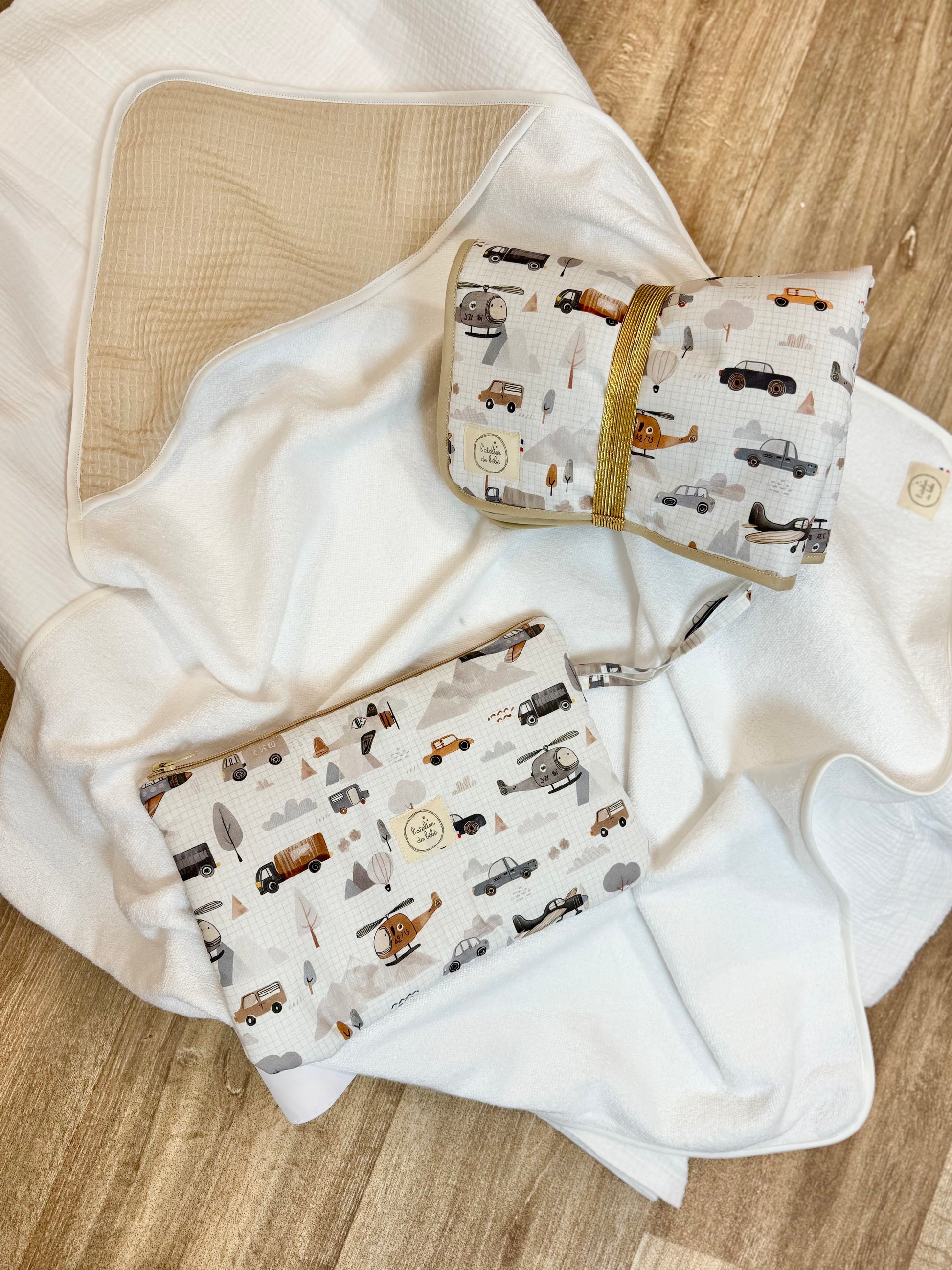 Découvrez notre ensemble voyage trois en un, le compagnon indispensable des parents en déplacement. Composé d'une trousse de toilette pratique, d'un tapis à langer nomade et d'une cape de bain ultra-douce, cet ensemble offre tout ce dont vous avez besoin dès la maternité.