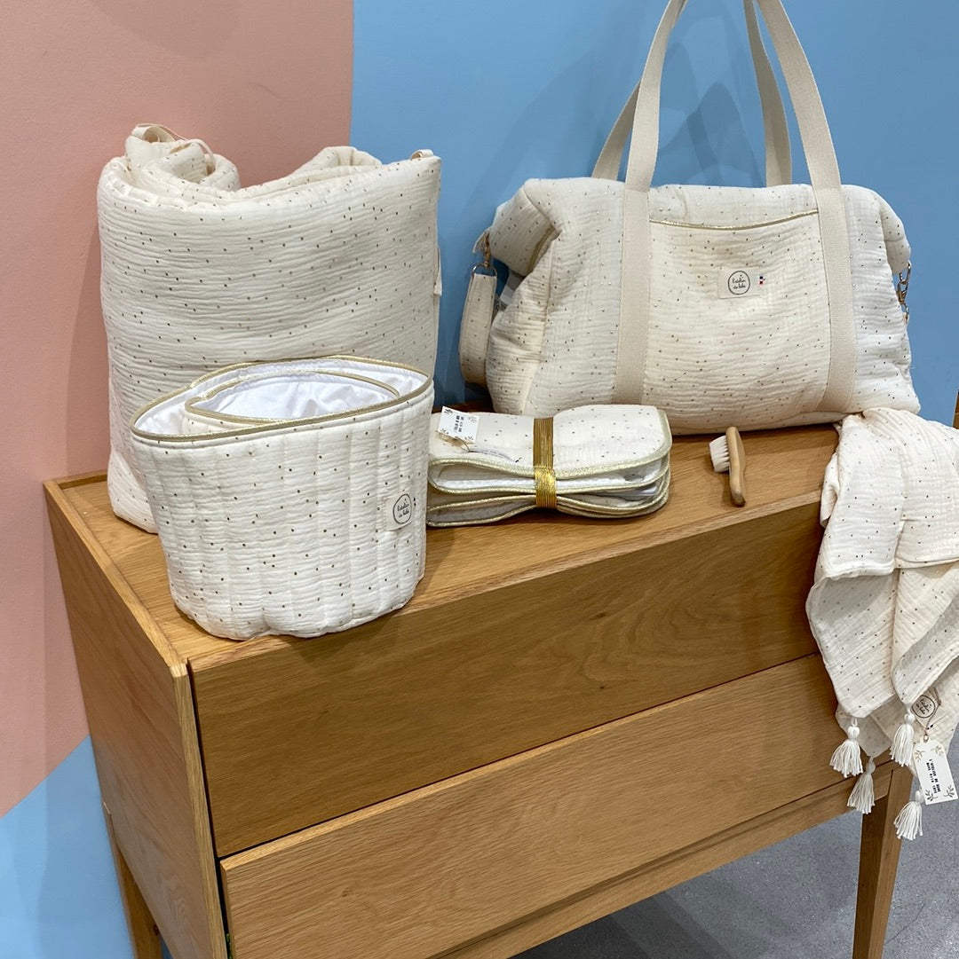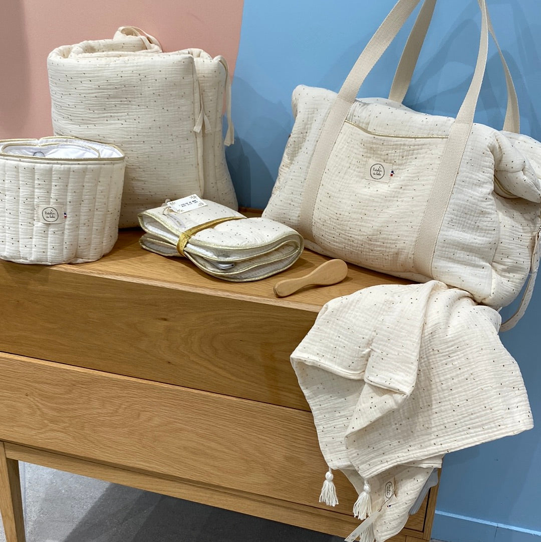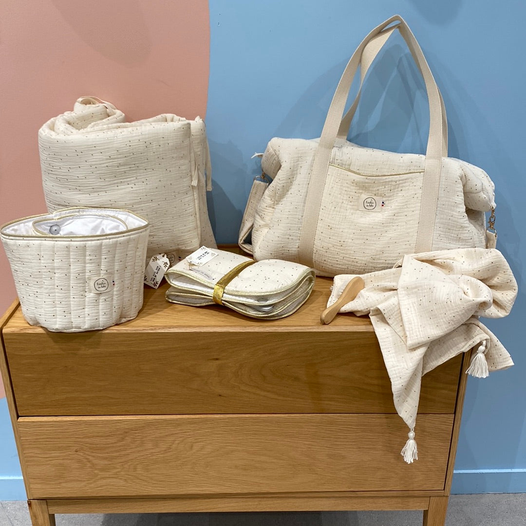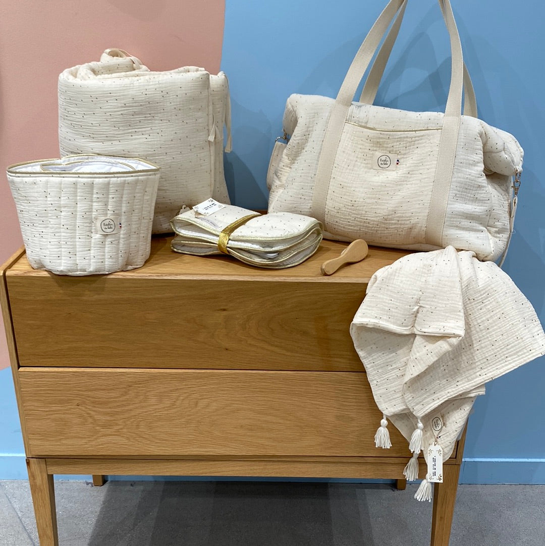 Le trousseau naissance écru pois or est un produit unique et adorable, certifié Oekotex et fait main, pour le plus grand luxe et confort de votre bébé. Fabriqué en coton doux et délicat, ce trousseau est un must-have pour votre petit trésor.