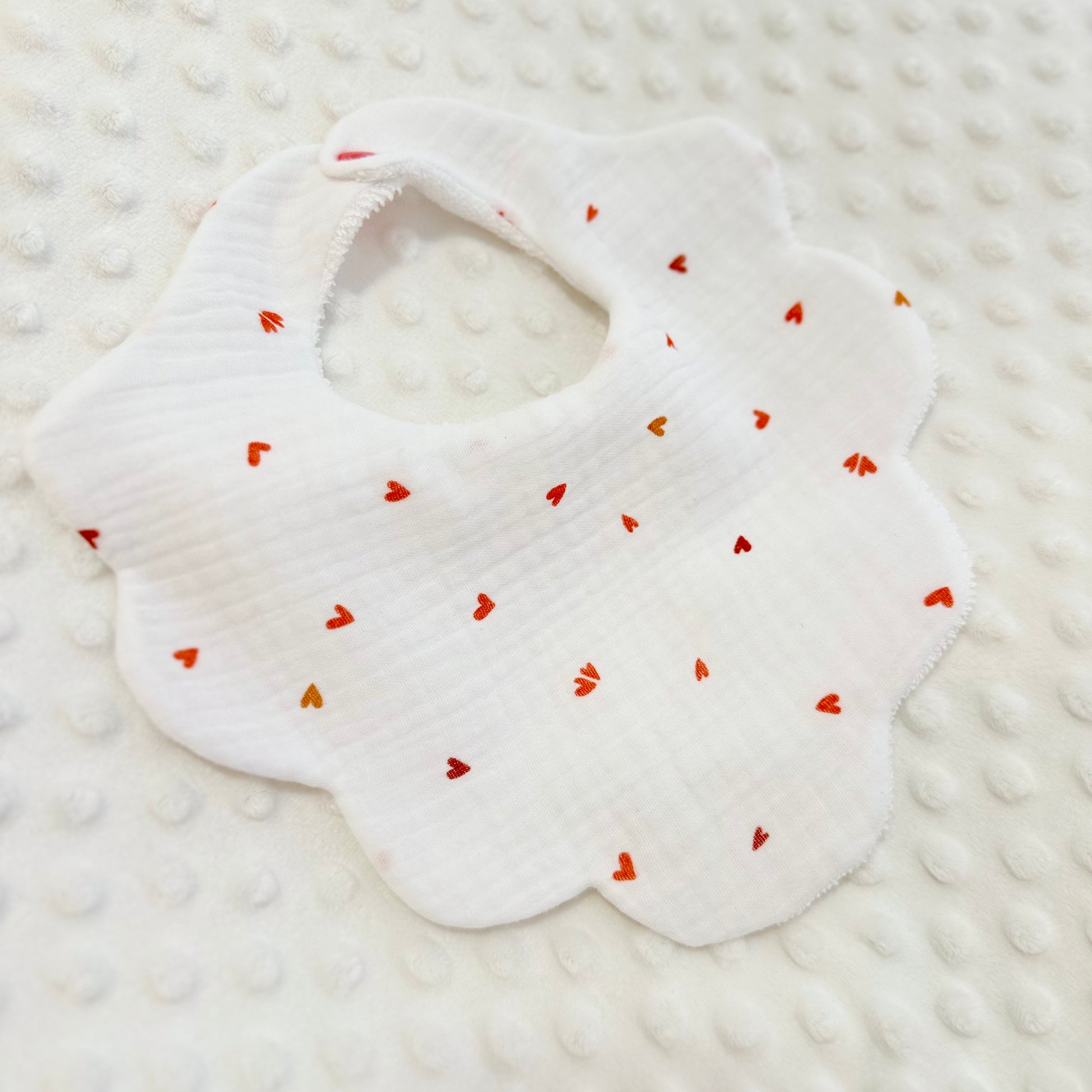 Ce bavoir en forme de fleur, avec son imprimé petit coeur, est parfait pour compléter un look. Fabriqué en gaze de coton et en bambou, cette édition limitée offre un confort et une qualité supérieurs. Idéal pour les petits gourmands !