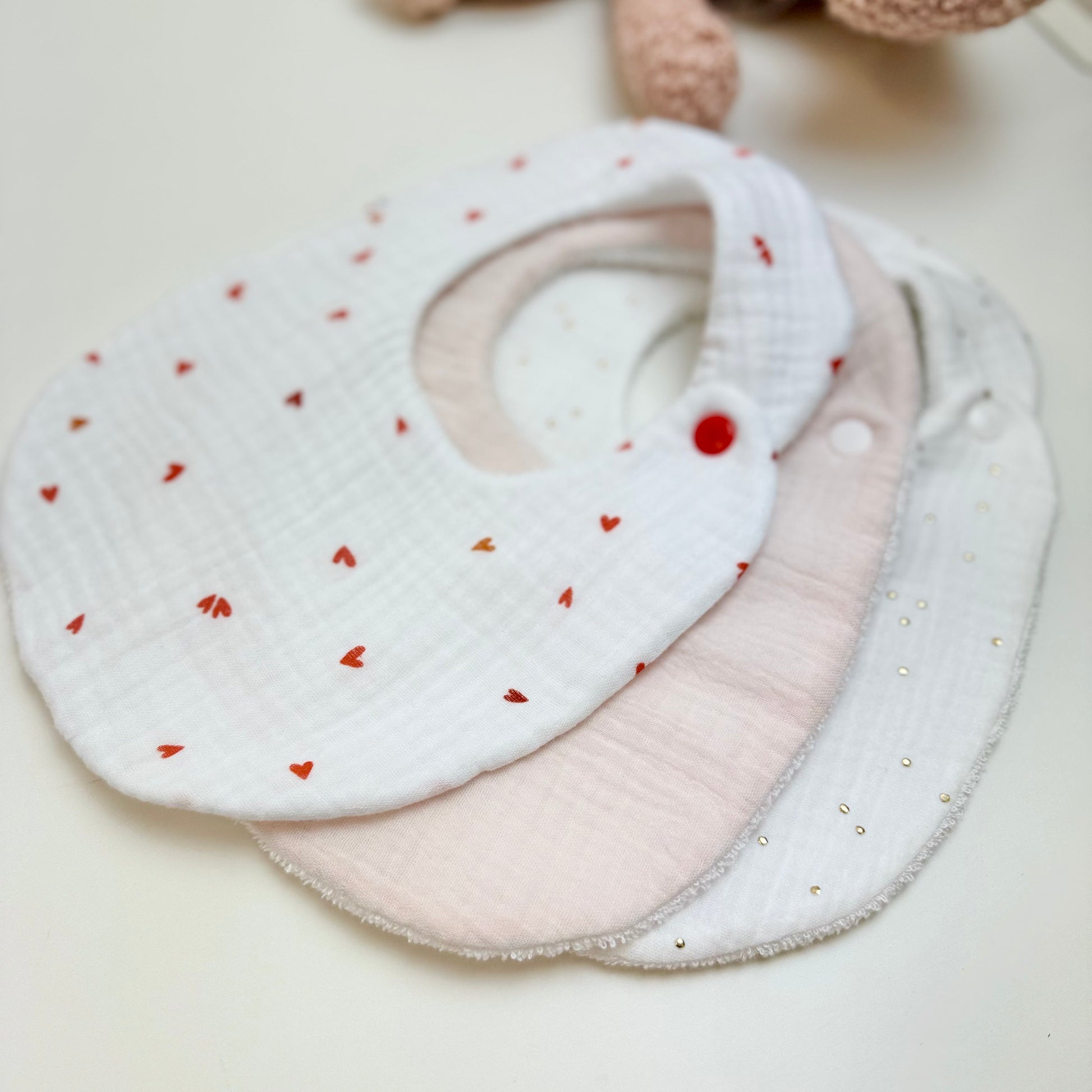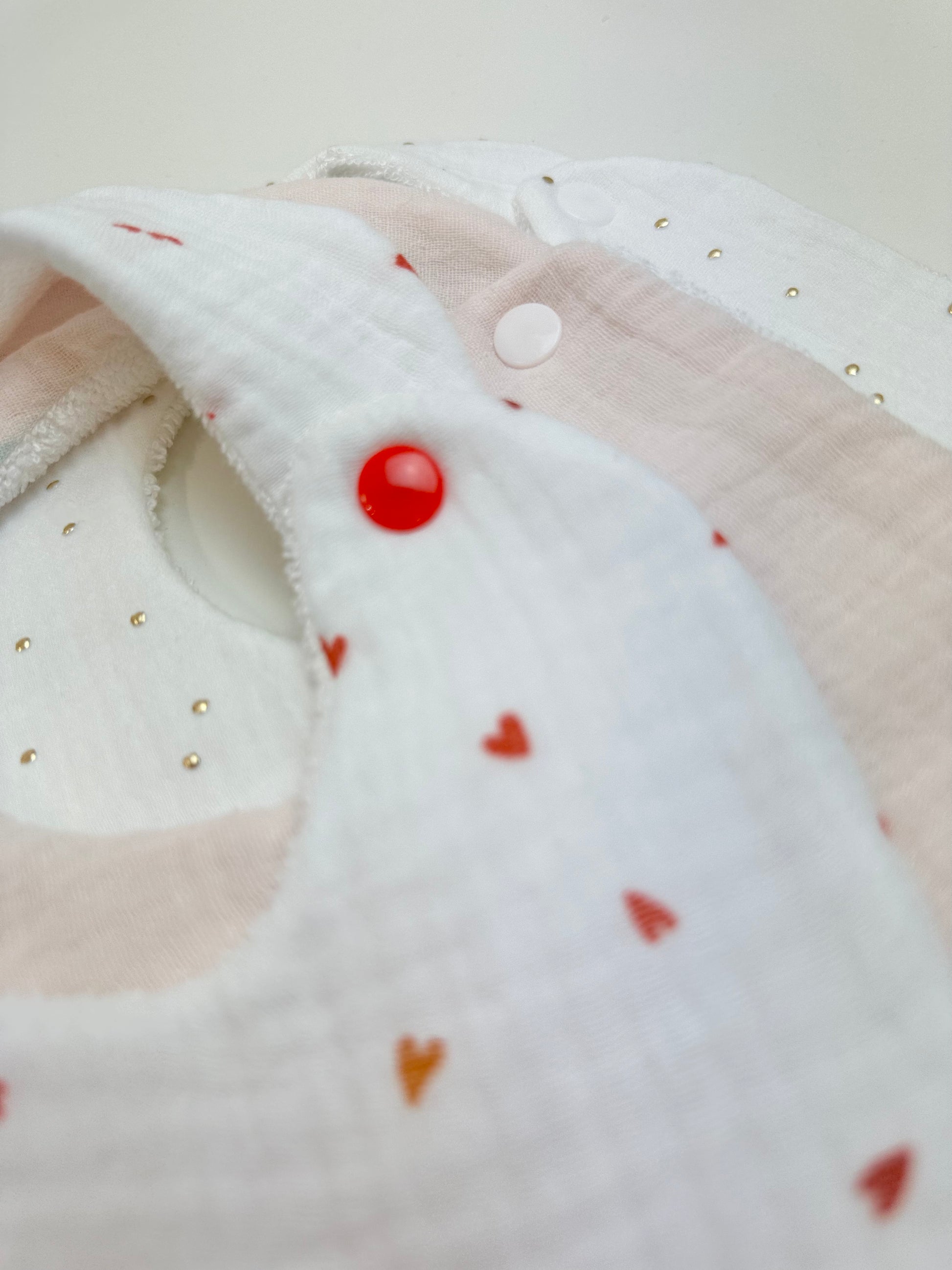 Bavoir Trio gaze de coton petit coeur blanc et écru pois or