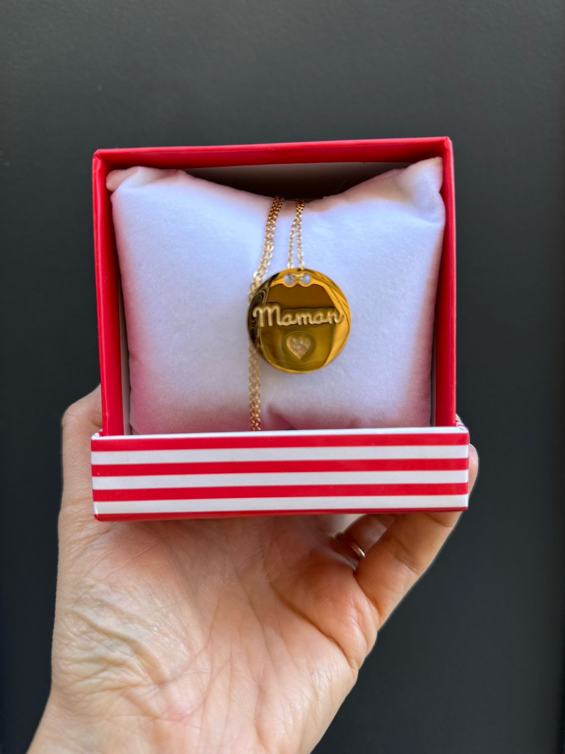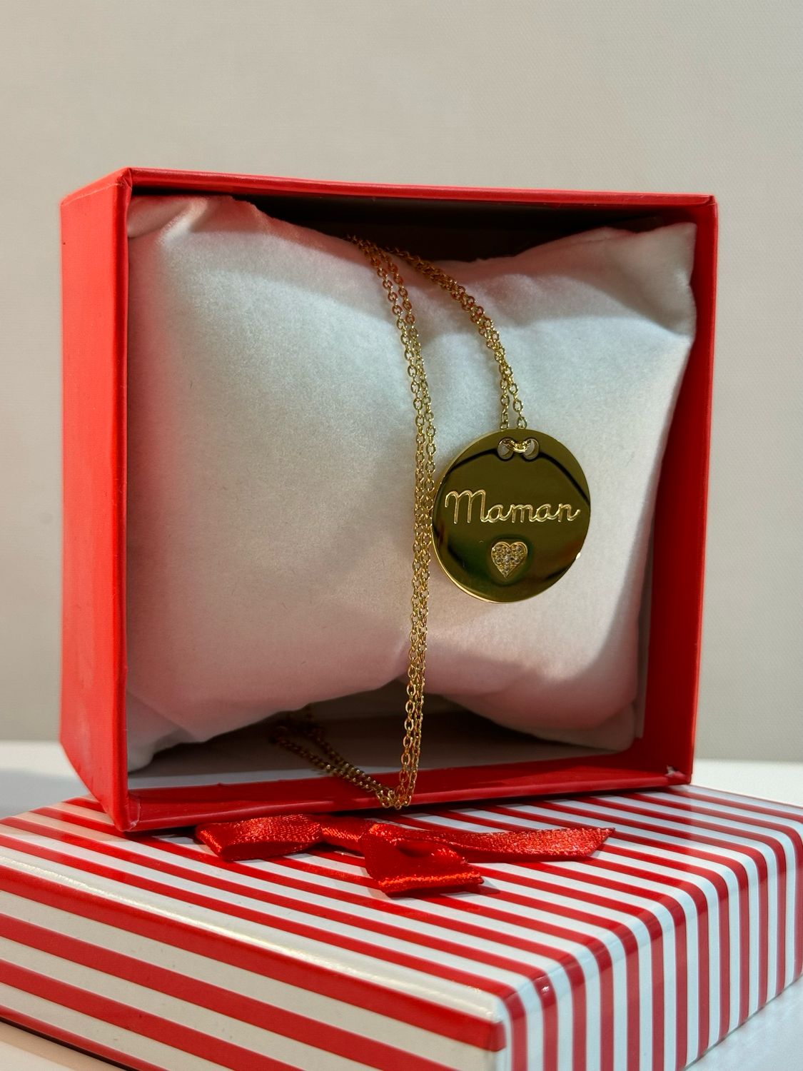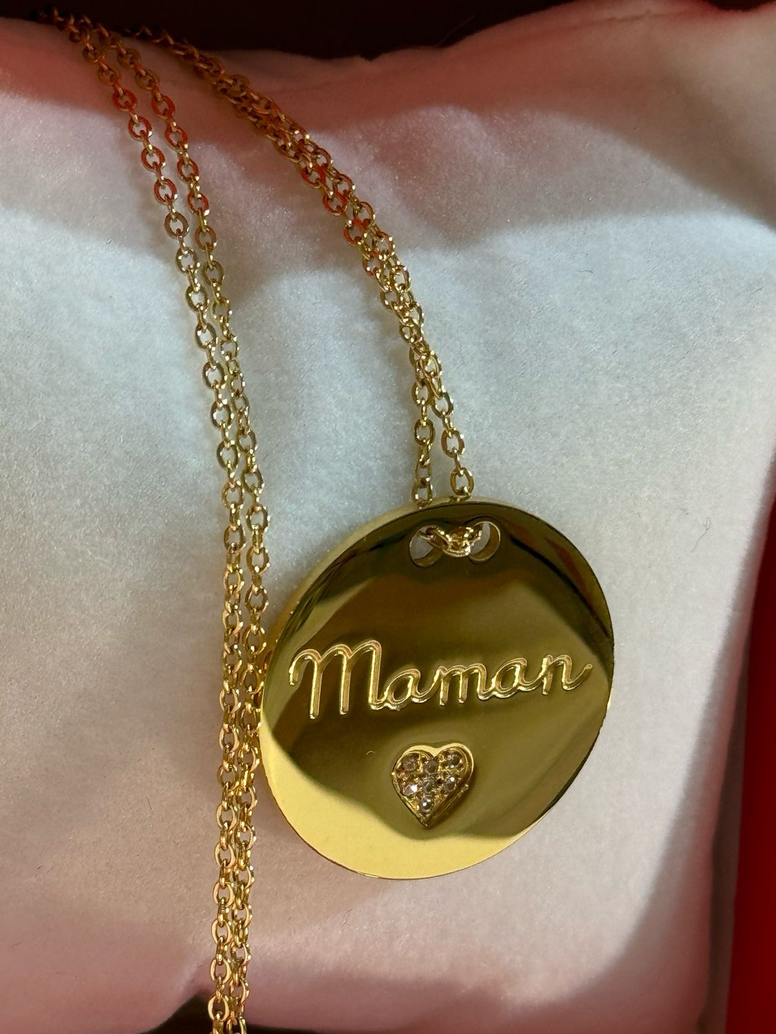 Idéal pour la fête des mères ou pour célébrer une naissance, ce collier en acier inoxydable doré comprend un médaillon gravé "maman" et un petit cœur orné de zirconium. Sa chaîne longue permet de le porter en sautoir pour un look élégant et tendance. Un bijou parfait pour montrer tout votre amour à votre mère ou a un proche .