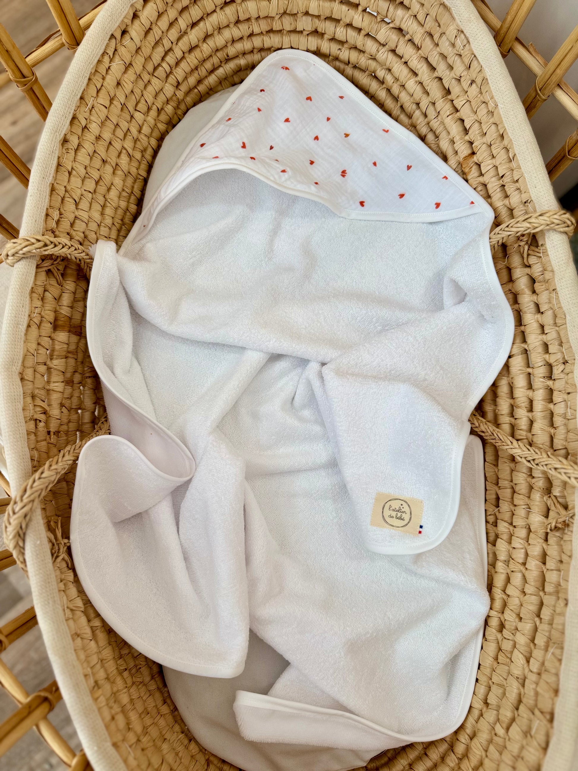 En éponge de coton toute douce et ultra absorbante, la cape de bain de L'atelier de bébé est idéale dès les premiers jours de bébé.