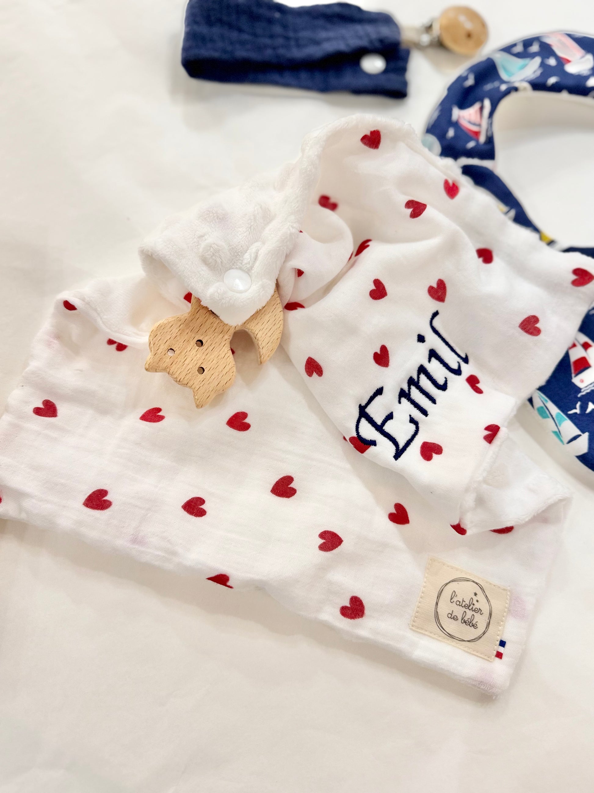 Le bouton en résine permet de détacher facilement le lange pour l'utiliser comme attache-tétine. Pratique et réconfortant, il essuie les bavures tout en servant de doudou apaisant.