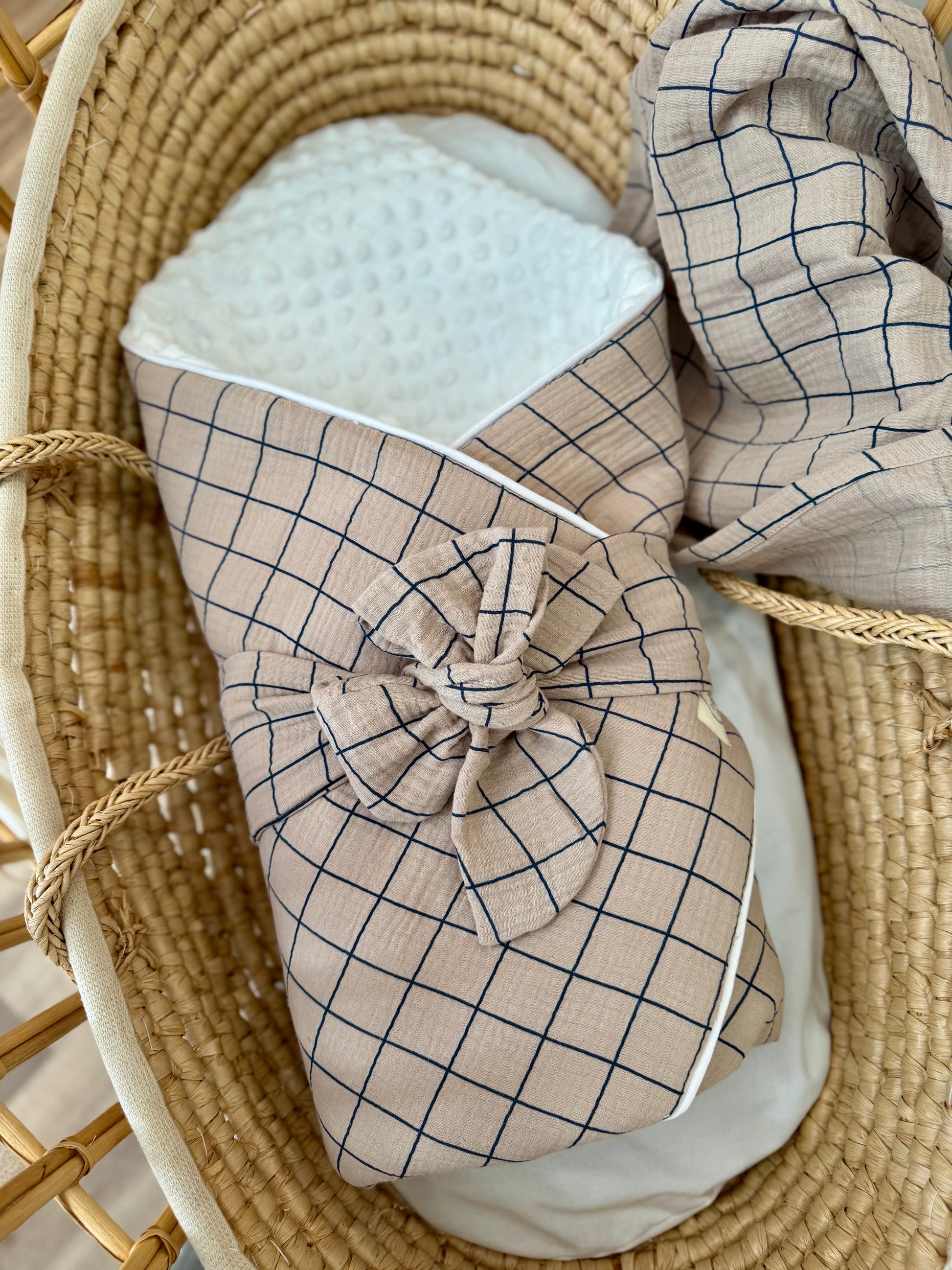 Nid d'ange carreaux taupe - 1ere couverture de naissance personnalisable